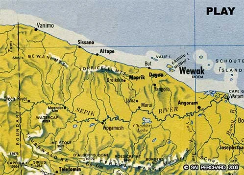 The two regions of the study are linked by the Sepik River that rises in central New Guinea and flows north then east through its upper basin. The Sepik was first explored by a Hamburg museum expedition 1908-10, then more thoroughly by Richard Thurnwald for a joint expedition by German museums during 1912-14 (Thurnwald 1914, 1916). Thurnwald followed the Sepik up to its source near Telefomin. He also explored its tributaries in the Upper Sepik Basin – the Yellow and Sand Rivers, the North River, the Hauser (Green) and October Rivers. During these expeditions, objects of material culture were collected, many of which are in the Berlin Museum (Kelm 1966). Click the map below to open an animated depiction of Thurnwald’s journeys in the upper Sepik Basin in a new window (Flash required).